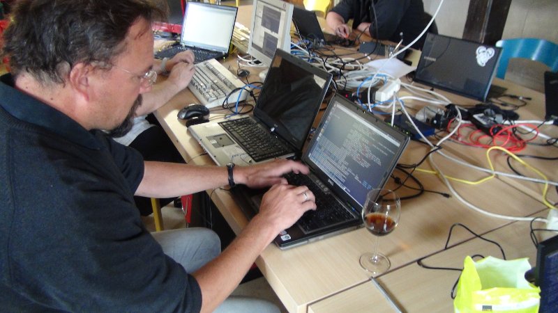 Nach dem genussreichem Morgen Essen machten sich die meisten wieder daran an Ihre Projekte zu arbeiten. Eines der Hauptthemen und Diskussionen welche am Mittag geführt wurden war der Streitpunkt in wie weit Android aus open Source quellen kompiliert werden kann ohne das man auf binäre geschlossene Komponenten angewiesen ist. Gemäss meines wissen besitzen einige Produkte wie der Webbrowser Chrome kernkomponenten welche geschlossen sind und bis heute nur im Binären Format verfügbar sind. Beim Android gibt es ebenfalls die sogenannten geschlossenen binären "Proprietary BLOBs" die nicht als open source verfügbar sind. Benedikt vertrat zu meiner Überraschung die Meinung das Android 100% Open Source wäre was ich jedoch aus eigener Erfahrung beim Portieren nicht wirklich bestätigen kann. Einer der Chef Entwickler von Android hat unter anderem genau wegen solchen simplen Binären Proprietary BLOBs die Stelle gekündigt mit dem Zitat "'''there’s no point being the maintainer of an Operating System that can’t boot to the home screen on its flagship device for lack of GPU support.'''" => Prime Project developers quits Android