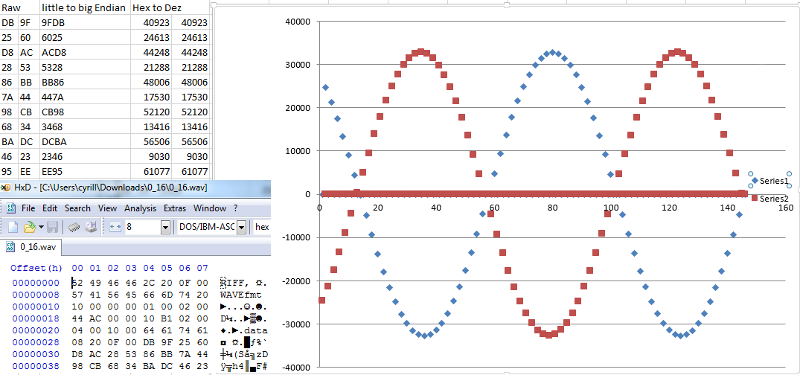 Wave-File Dateiformat![]() Um Programmcode zur Erzeugung von Microsoft Wave-Dateien (Dateien mit .wav Dateierweiterung) schreiben zu können, wurde das Dateiformat von Wave-Dateien analysiert. Als Grundlagen dienten die Dokumentation von Craig Stuart Sapp sowie Sinuston-Testwavedateien von RME. Mithilfe der Dokumentation wurden die Hexadezimalwerte der Testdatei analysiert. Die Hexadezimalwerte wurden mit den Eigenschaften der Datei verglichen und die entsprechenden Umformungen von Little Endian nach Big Endian und von Hexadezimal zu Dezimal wurden nachvollzogen. Die Umformungen wurde als persönliche Gedächtnisstütze und zum Nachverfolgen für Dritte in einem Dokument festgehalten. |